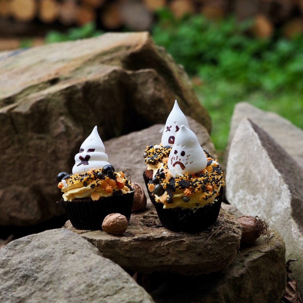 Cukrářský sáček se zdobicí hladkou špičkou (12 mm) naplníme sněhem. Na plech vyložený pečicím papírem stříkáme duchy. Je lépe si jich udělat víc než bude cupcakes, kdyby nějací při manipulaci s nimi popraskali.